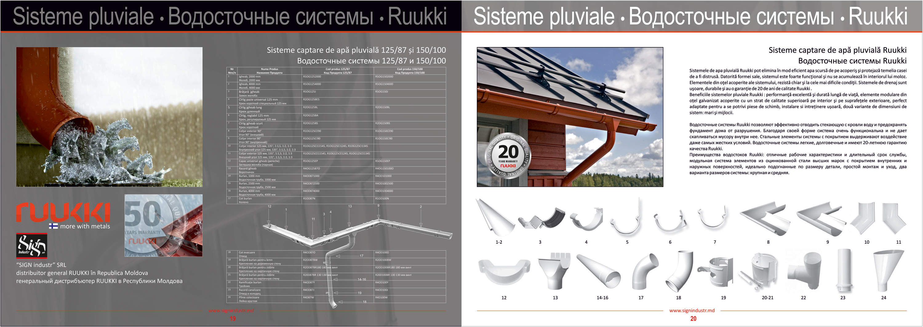 - Водосточные системы в Молдове: (2-а типоразмера) из финской стали, которые позволяют эффективно отводить стекающую с кровли воду и предохранять фундамент дома от разрушения. Стальные элементы системы с покрытием выдерживают воздействие даже самых жестких условий. Водосточные системы легкие, долговечные и имеют 20-летнюю гарантию качества Ruukki.