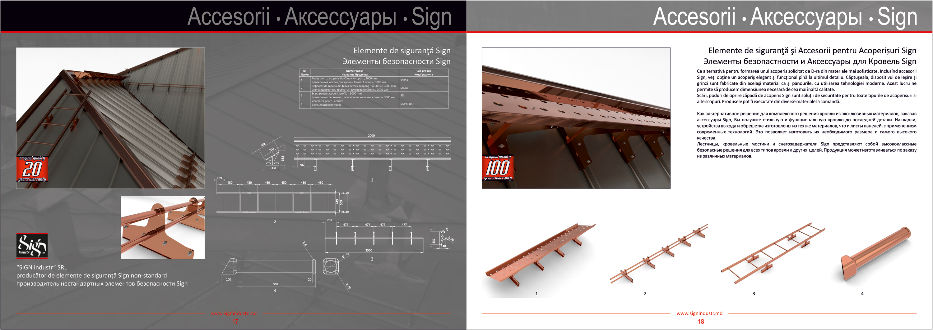 - Аксессуары SIGNтакие как: эксклюзив из алюминия, меди, такие как переходные мостики, снегозадержатели, лесницы, ограждения, и др. Изготавливаются под конкретный заказ.