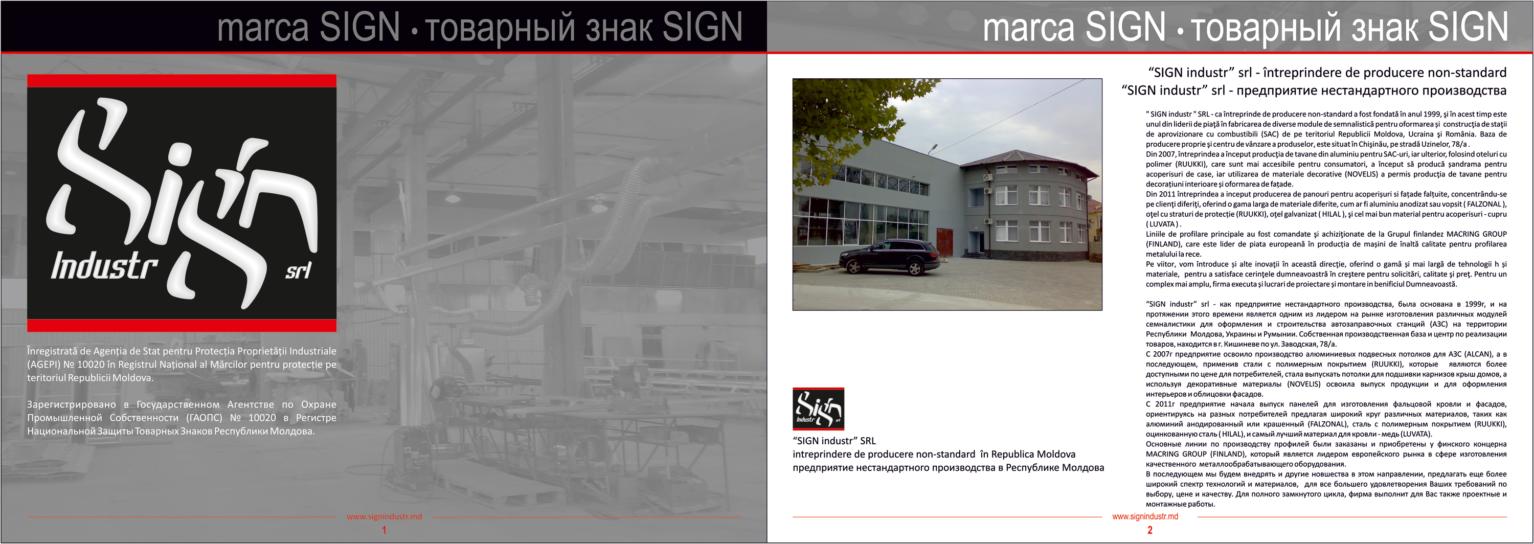 “SIGN industr” SRL была основана в 1999 г, и на протяжении этого времени является одним из лидером на рынке изготовления различных модулей для оформления и строительства автозаправочных станций - семналистика АЗС на территории Республики Молдова, Украины и Румынии. Собственная производственная база и центр по реализации товаров, находится в г. Кишиневе по ул. Заводская, 78/а.